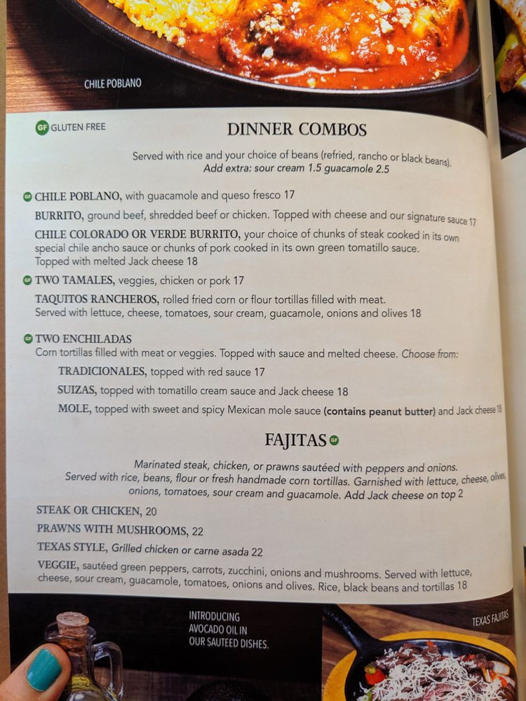 Sauteed choice of meat, onions, green peppers and mushrooms in a garlic cream sauce. Topped with green tomatillo sauce, Jack cheese, sour cream and avocado slices. Served with rice and beans on the side.